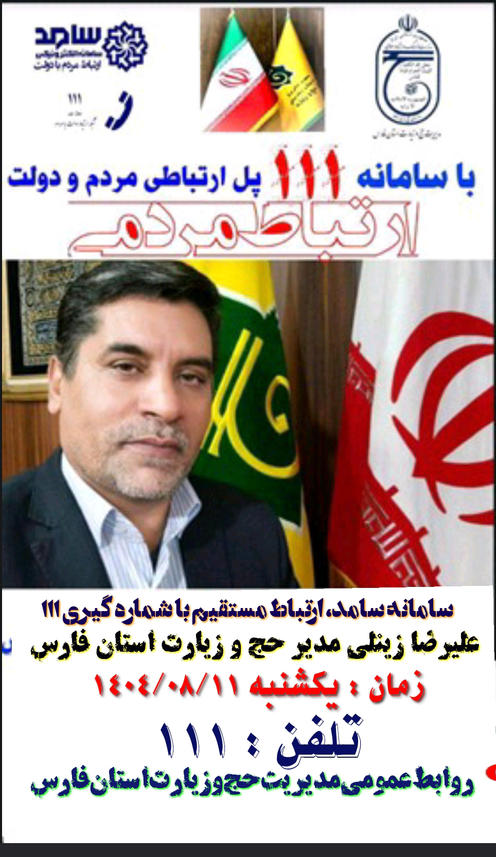 "علیرضا زینلی" مدیر حج و زیارت استان فارس *پاسخگوی مردم و فعالان و کارگزاران زیارتی در حوزه حج و زیارت در سامانه سامد « از طریق شماره گیری با ۱۱۱ » خواهد بود*